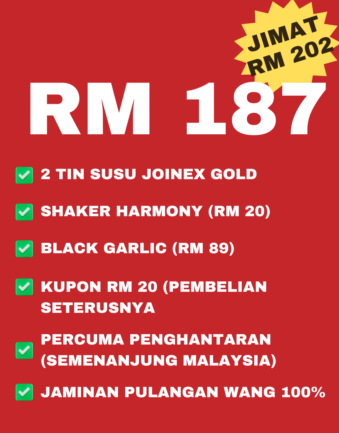 ⚠️ PENAFIAN: Susu Joinex Gold adalah minuman kesihatan yang diformulasikan dengan 23 nutrisi penting, termasuk kolostrum, kalsium, kolagen, dan vitamin D, bertujuan untuk menyokong kesihatan tulang, sendi, dan otot. ​Walau bagaimanapun, keberkesanan produk ini mungkin berbeza bagi setiap individu, bergantung kepada faktor-faktor seperti keadaan kesihatan semasa, konsistensi pengambilan, gaya hidup dan pemakanan harian. Tindak balas tubuh terhadap nutrien tertentu. Produk ini bukan ubat dan tidak bertujuan untuk mendiagnosis, merawat, menyembuh atau mencegah sebarang penyakit. Ia adalah suplemen kesihatan yang menyokong fungsi tubuh secara umum.